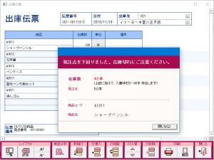 出庫伝票画面(発注点警告)