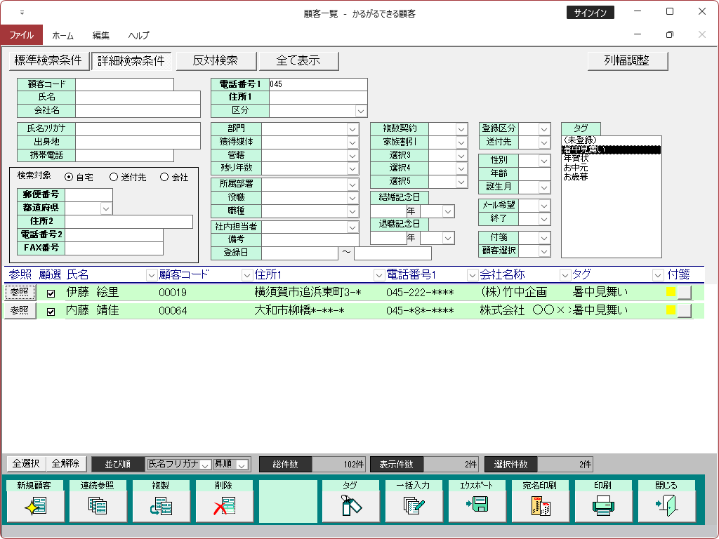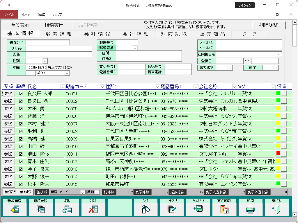 最もシンプルな「一覧画面」からの検索機能では、氏名・会社名・住所・電話番号などの各項目に検索条件を指定し、該当する顧客を抽出して一覧表示します。日常作業に適した手軽な操作性です。
