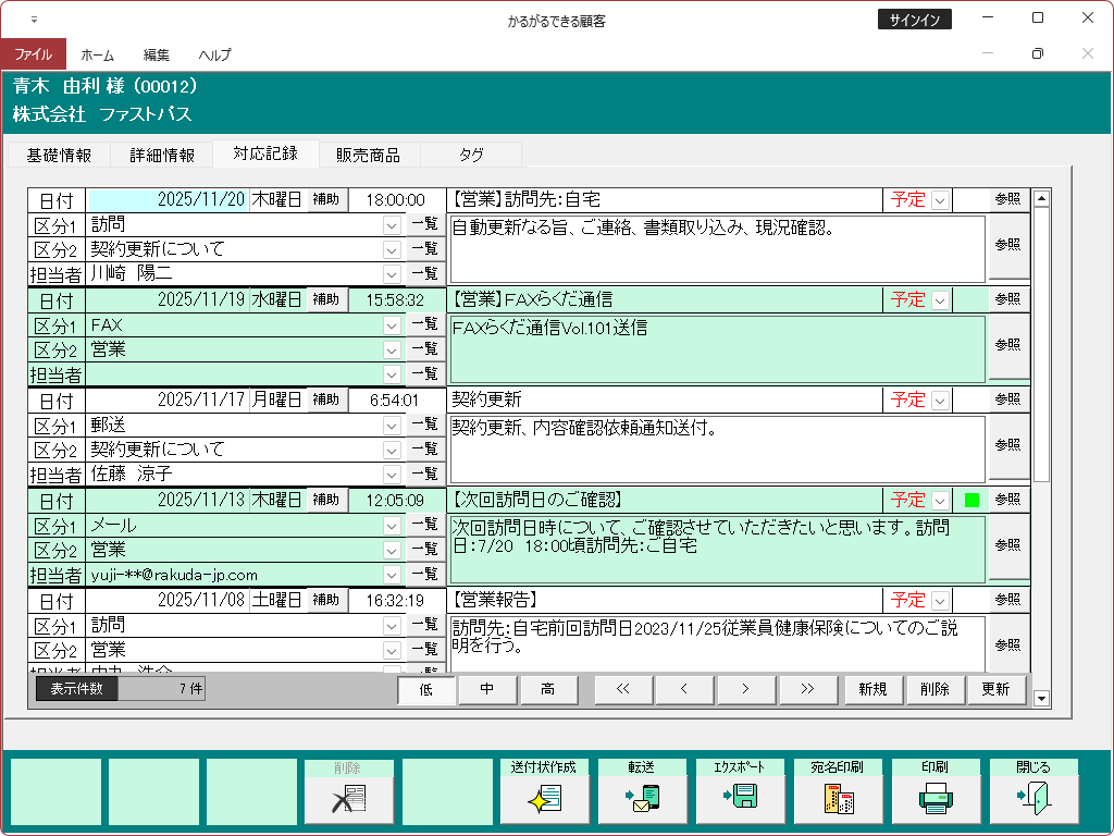 いつ訪問したのか、どんな問い合わせがあったのか、お中元・お歳暮の贈答品は何だったのか、どんなDMをいつ送ったか・・・。「対応記録」に顧客との様々なやり取りを入力して、履歴を管理できます。