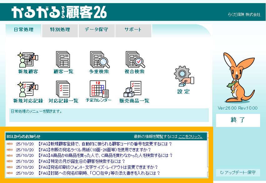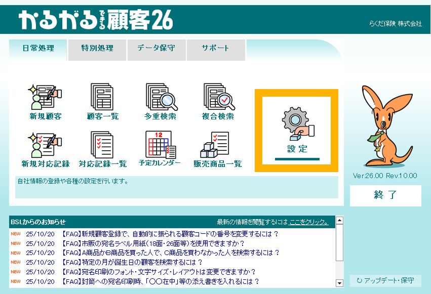 設定画面では、入力画面の動作や印刷方法などの設定を細かく指定することができ、データファイルのバックアップ等のメンテナンスを行う機能も用意されています。