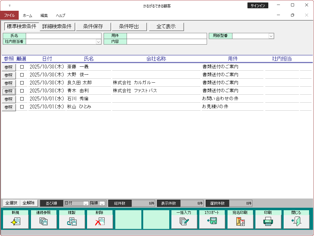 登録されている顧客を、顧客情報、会社情報、対応記録情報、販売商品情報のすべての条件を組み合わせて抽出できます。
