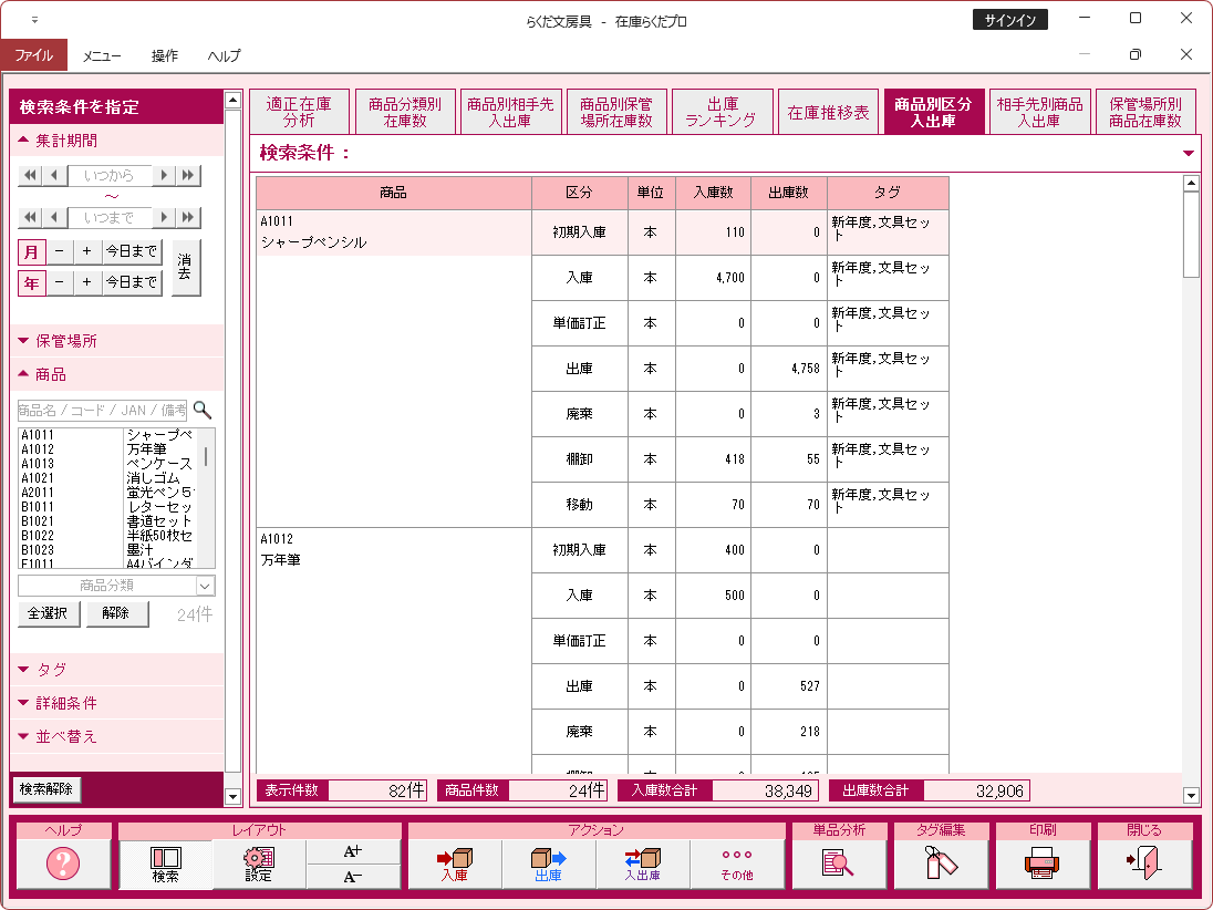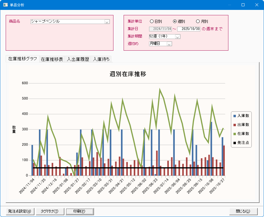 在庫履歴と在庫数をもとに、何日分の在庫があるのかが分かる「適正在庫分析」、年単位で入出庫の動向がわかる「在庫推移表」など、様々な分析ができます。在庫の状況を分析し、無駄な在庫などを防いで、適正な在庫数を保つことができます。
