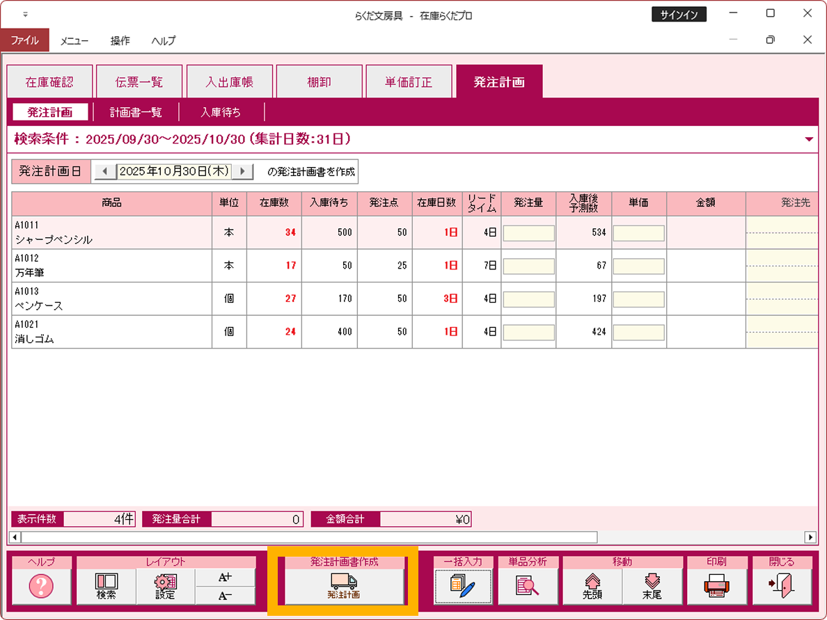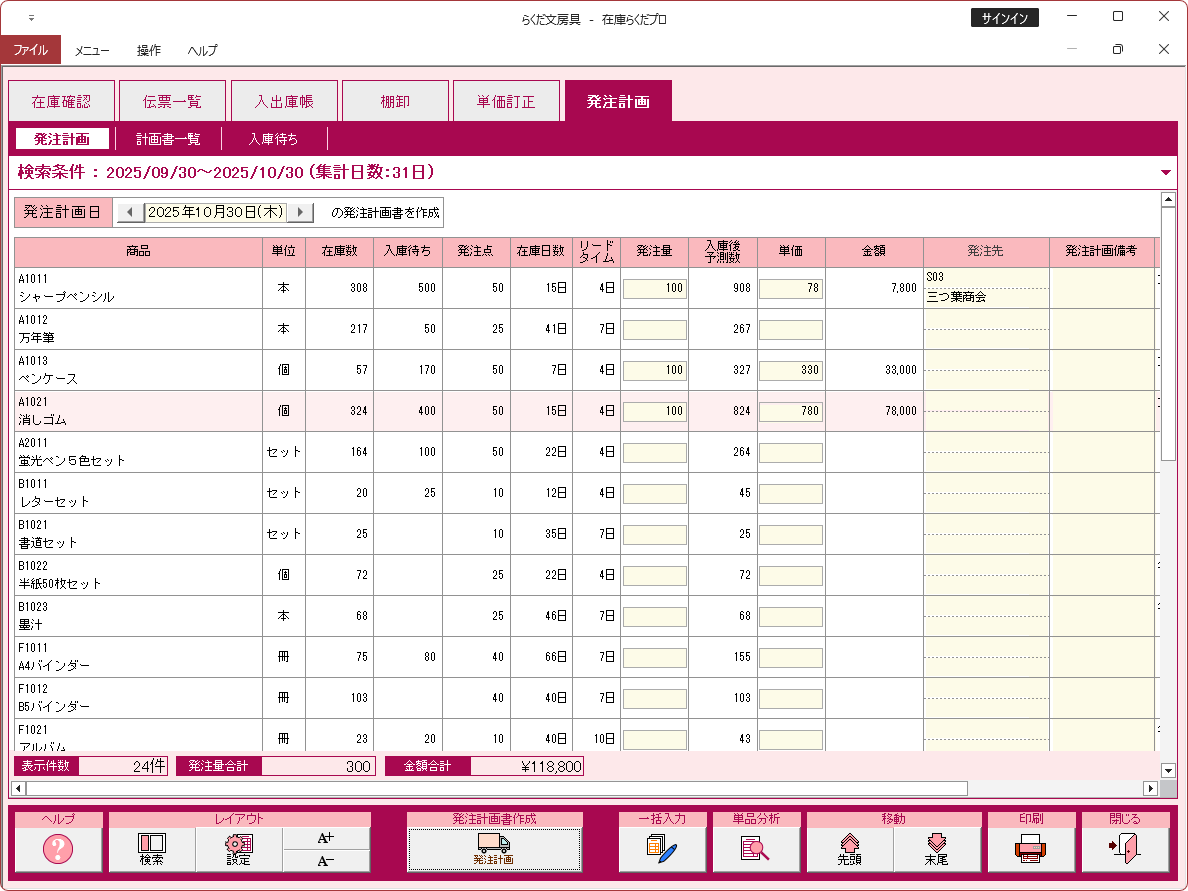 注文が必要な品目を素早く見つけ出し、発注内容をまとめた「発注計画書」を作成できます。「発注計画書」は印刷して発注担当者に渡したり、そのまま「注文書」形式で印刷したりできます。