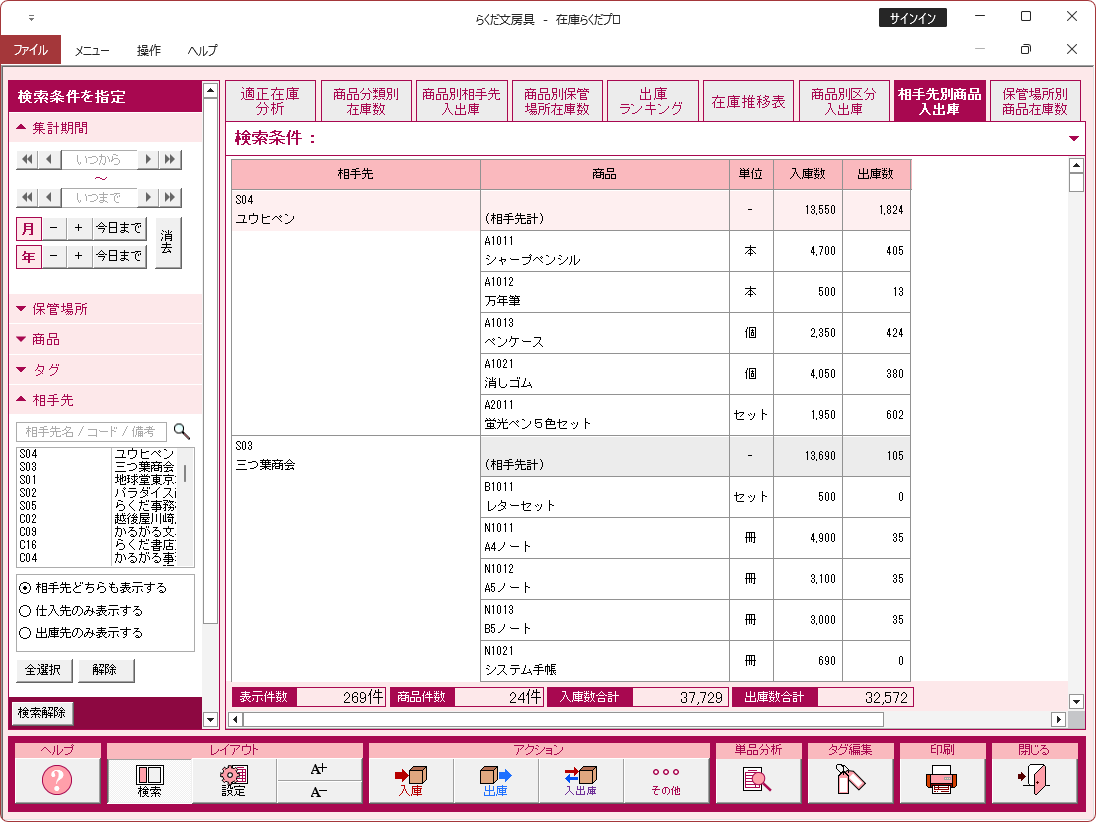 入出庫記録を一覧形式で表示し、直接入出庫の記録を入力することが可能です。検索機能で相手先、商品別など多彩な検索で、必要な履歴を抽出することができます。入出庫帳には、伝票形式で入力された入庫、出庫などの履歴も表示され、直接、伝票を編集することもできます。