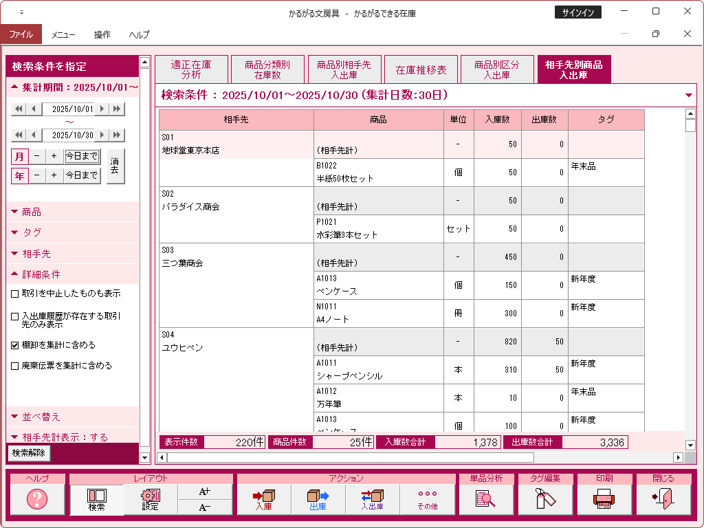 集計表・相手先別商品入出庫