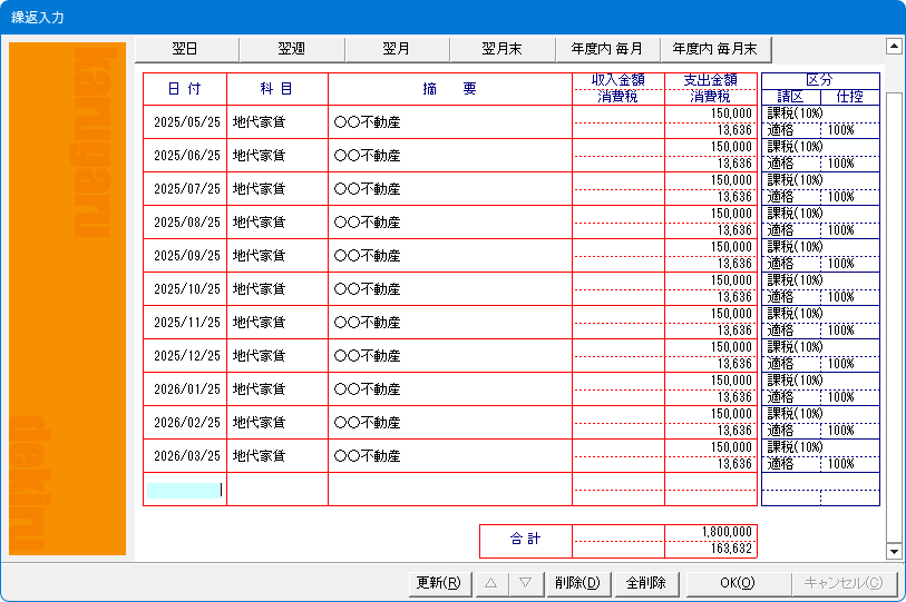 例えば、毎月決まった日に現金を振り込むというような、同じ内容の明細を繰り返し入力する必要がある場合などは、「繰返機能」を使ってまとめて記帳できるので、記帳忘れを防止できます。また、入力し忘れた取引も、記帳すると自動的に日付順に並べ替えられるので、手書きで記帳するより簡単に管理できます。