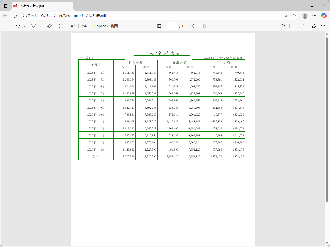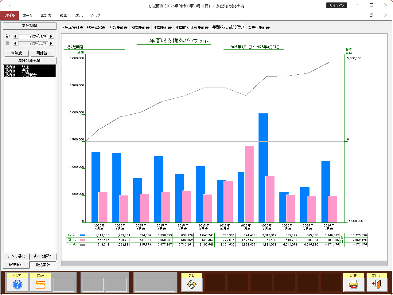 出納帳の内容を様々な方法で集計できます。入力した出納帳の内容を多角的な分析に利用できるので、経営改善や資金繰り計画の資料として活用することが可能になります。