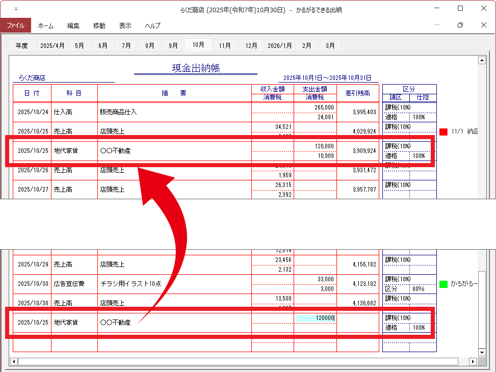 手書きの帳簿では修正するのも一苦労です。パソコンならではの機能を使って、記入し忘れた明細や間違った明細も簡単に追加したり修正したりできます。また、同じ日付であれば明細の順番を入れ替えられるので、表示する明細の順番を通帳通りに並べ替えることもできます。