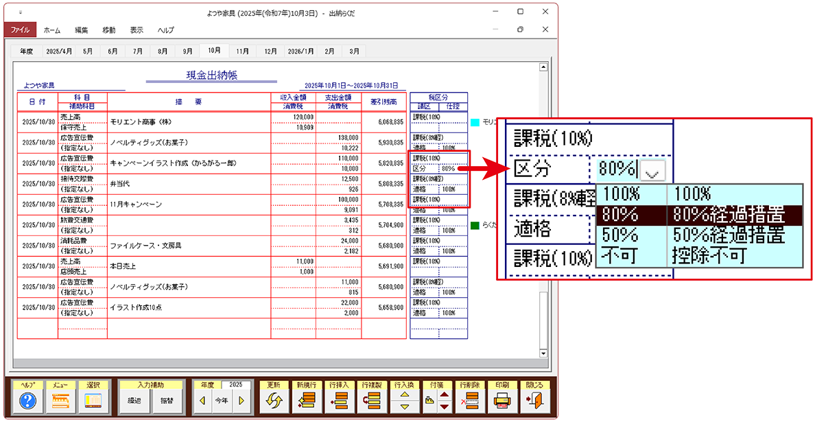 明細行ごとに税区分・請求書区分・仕入控除を指定できるので、インボイス制度の負担軽減措置を活用した処理が可能です。消費税区分ごとの集計資料も作成できます。
